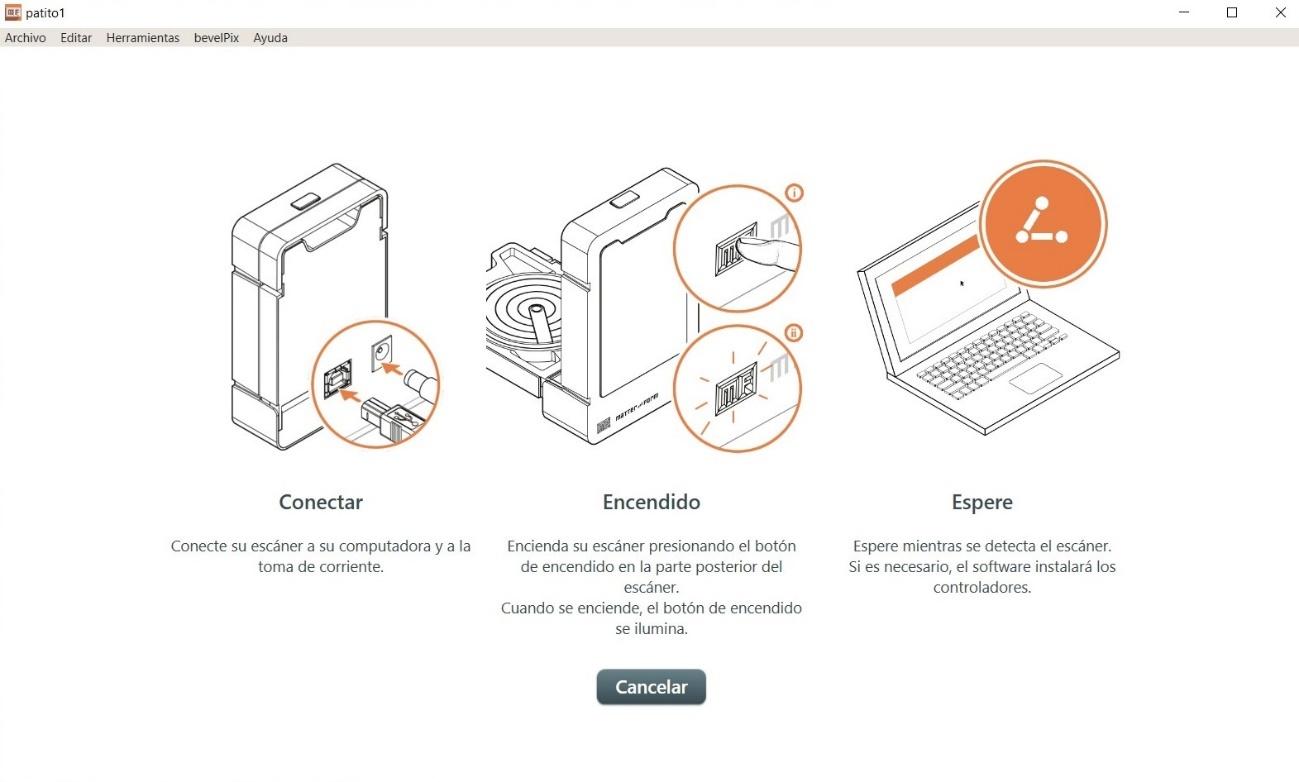 Later I prepared the equipment, connecting the scanner to the power supply and to the laptop using the USB cable. I verified that the device was correctly recognized by the software before continuing.