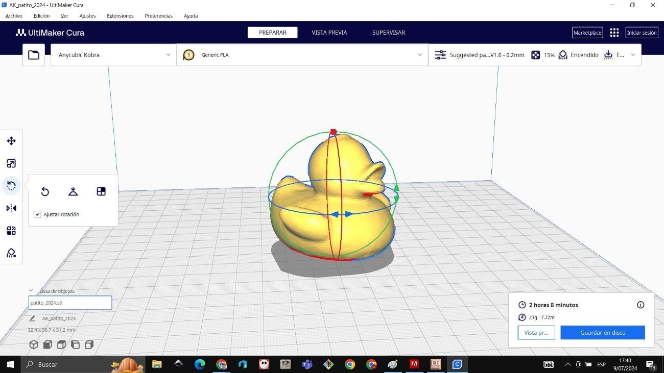 I imported the STL file into Ultimaker Cura. Within the software I modified the dimensions, reducing the size to 70%, obtaining an estimated printing time of 2 hours and 11 minutes.