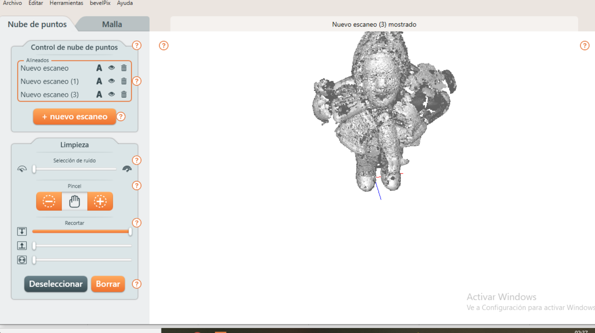 During the process, the point cloud that was progressively generated could be viewed on the screen. This point cloud represents the spatial information captured by the scanner.